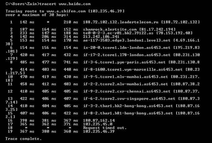 Whereas Baidu, which has servers only in China, has several “hops” spanning different countries, and has a high latency average from my location.