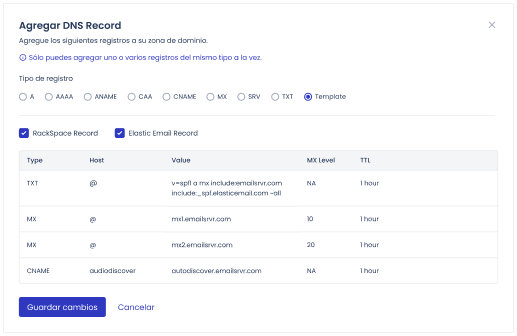 Aprovecha la configuración de registros de correo de nivel experto gracias a nuestras plantillas para Elastic Email y Rackspace Email.